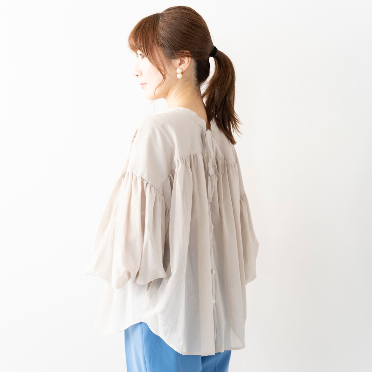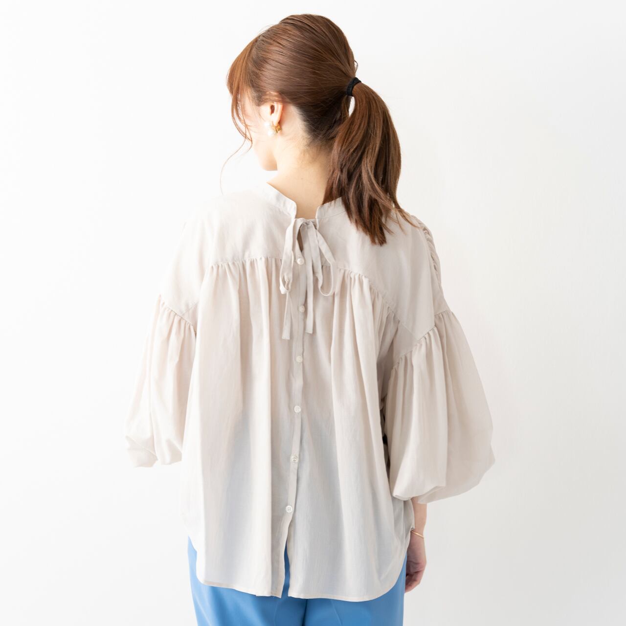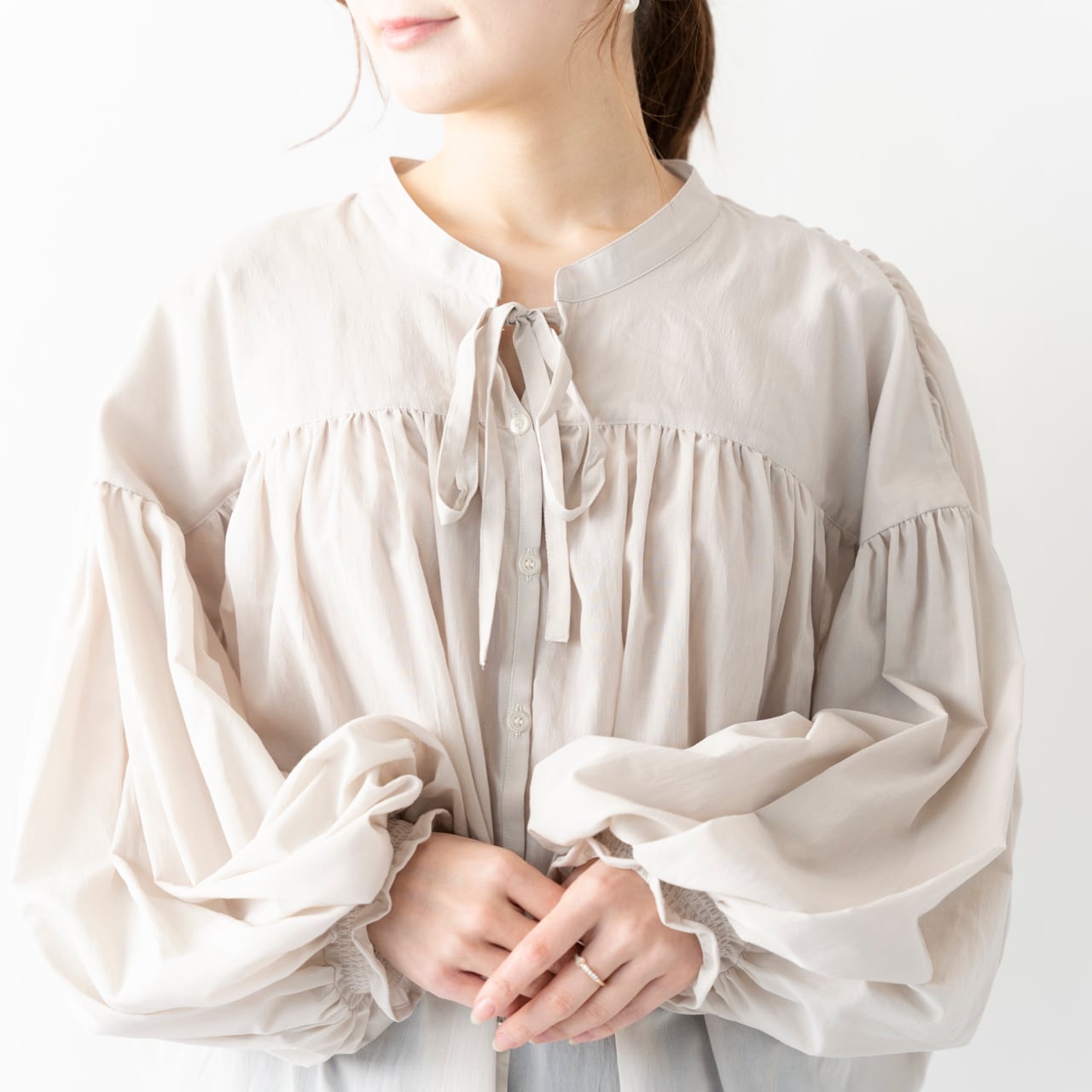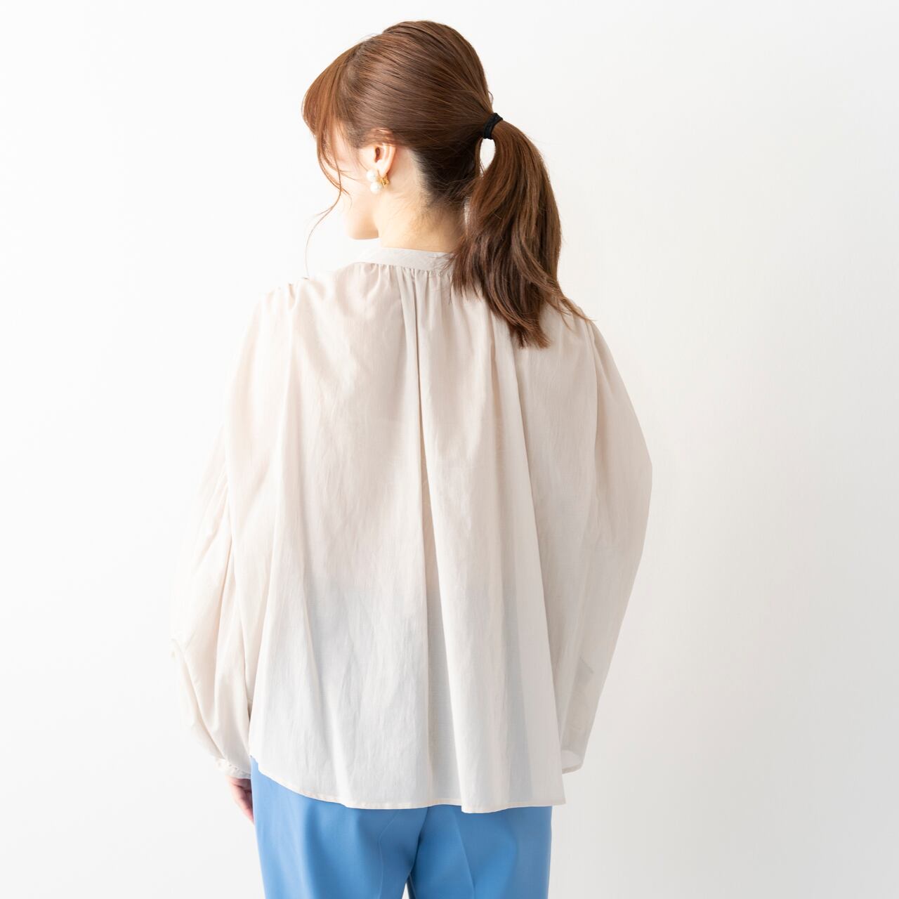 ボリューム感たっぷりのバンドカラーのギャザーブラウス。