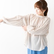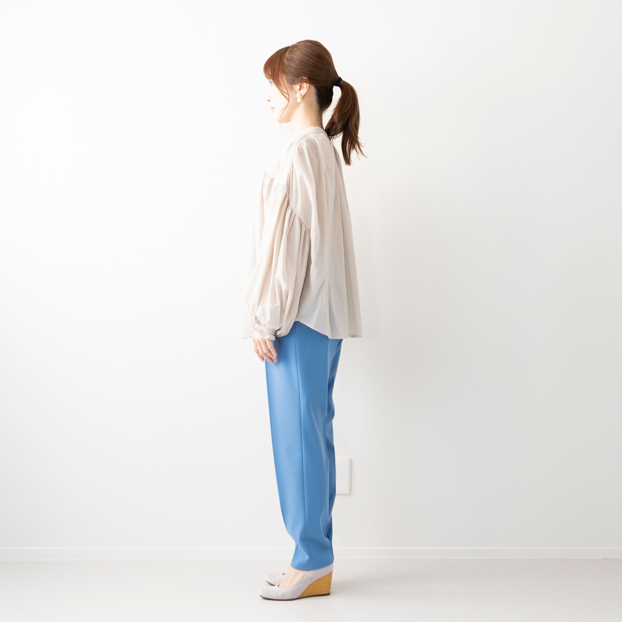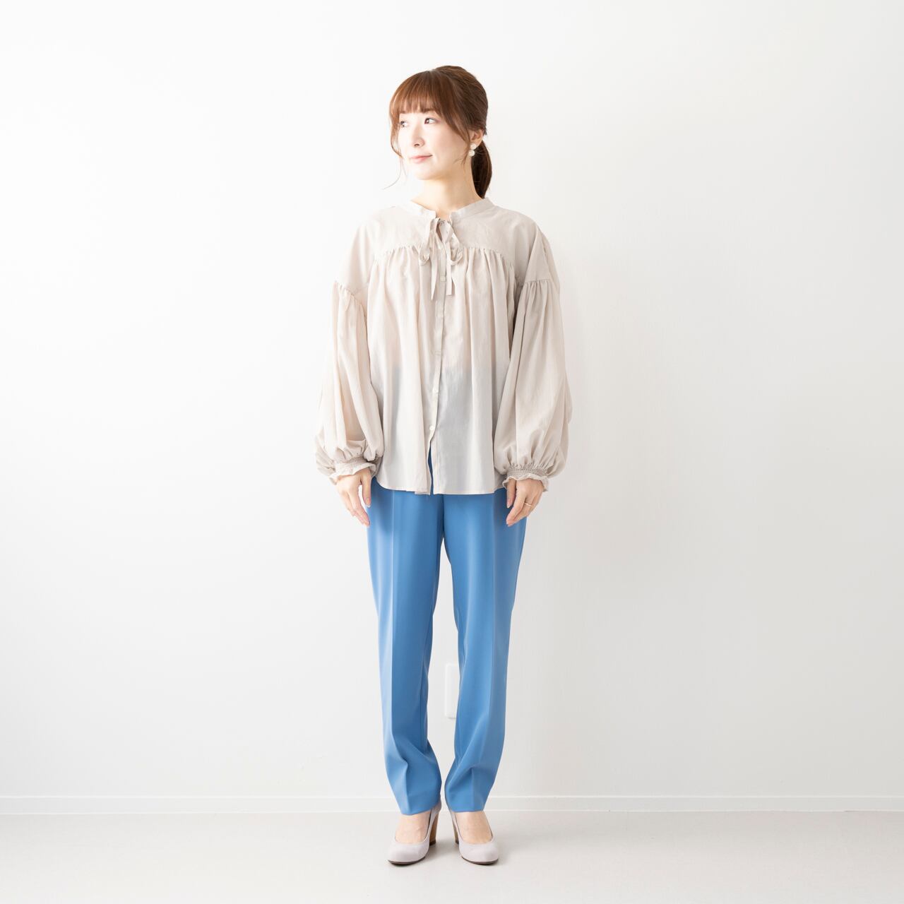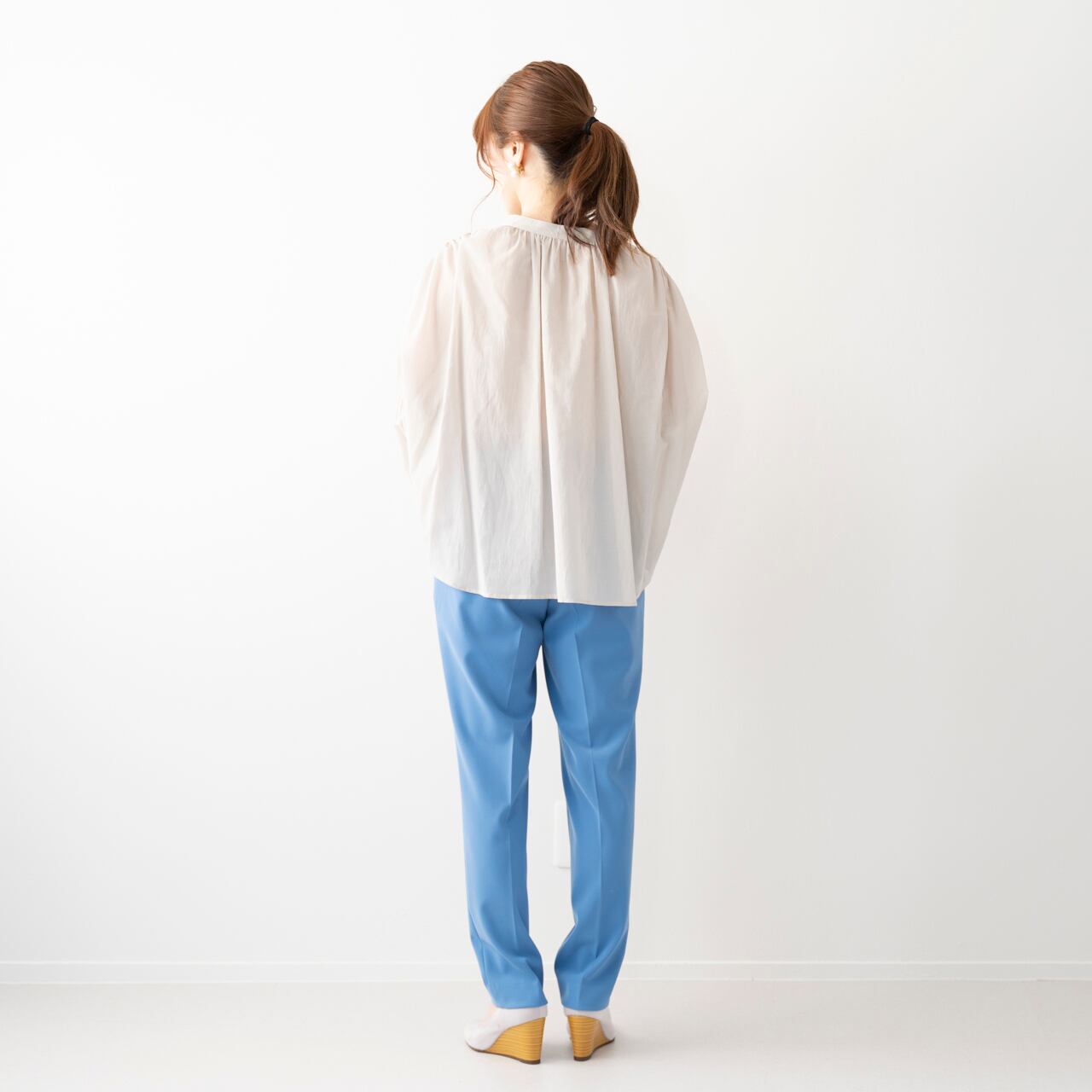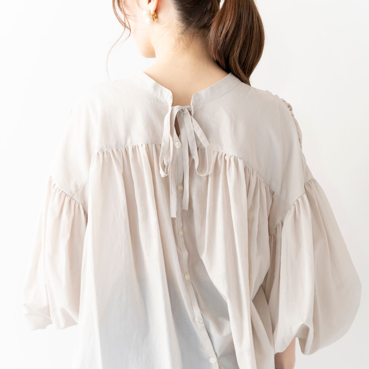 ボリューム感たっぷりのバンドカラーのギャザーブラウス。