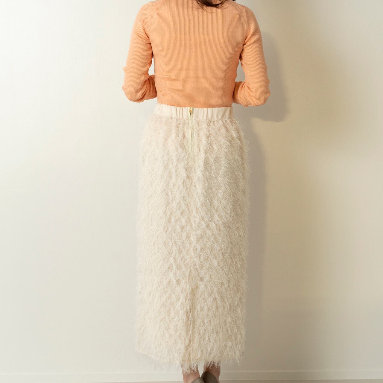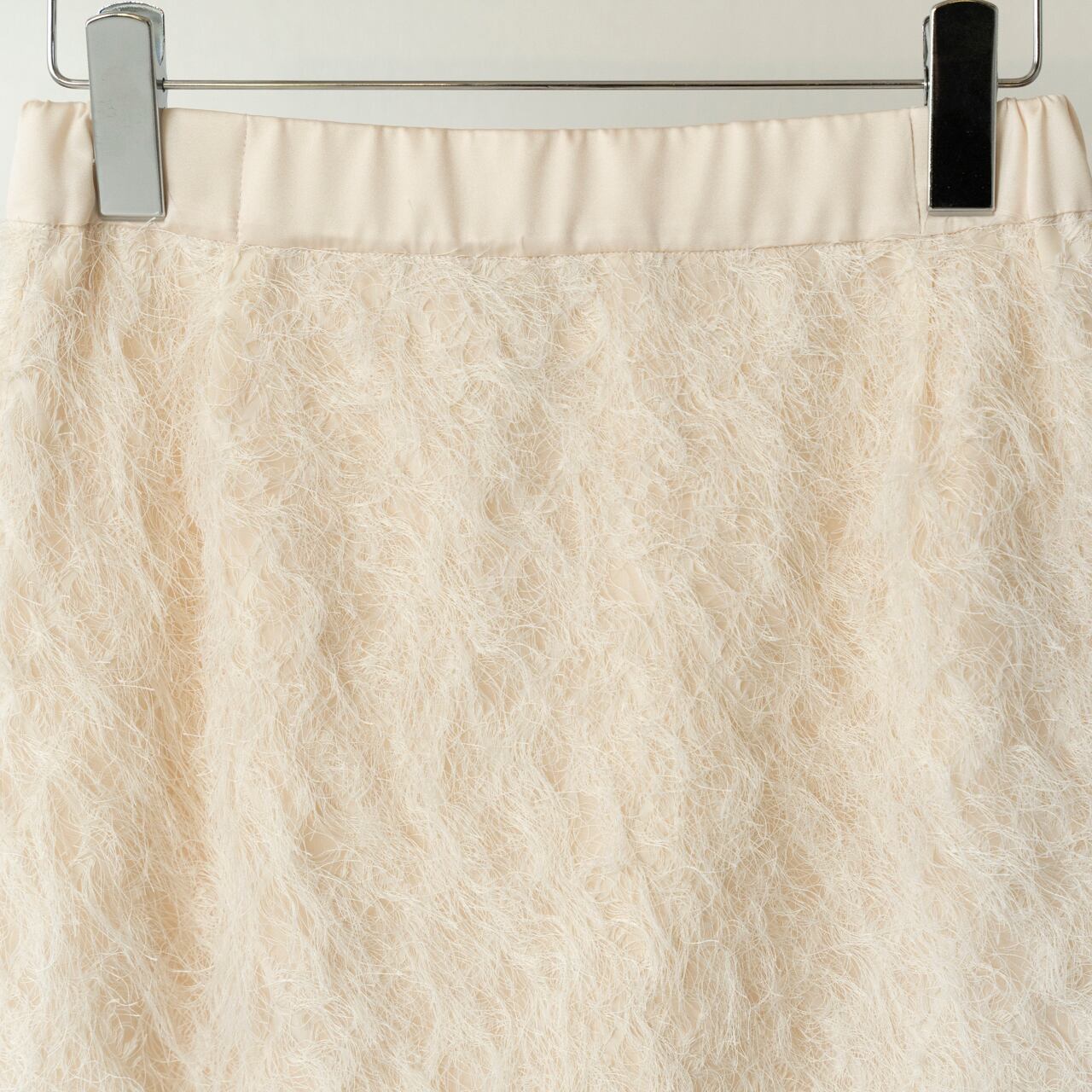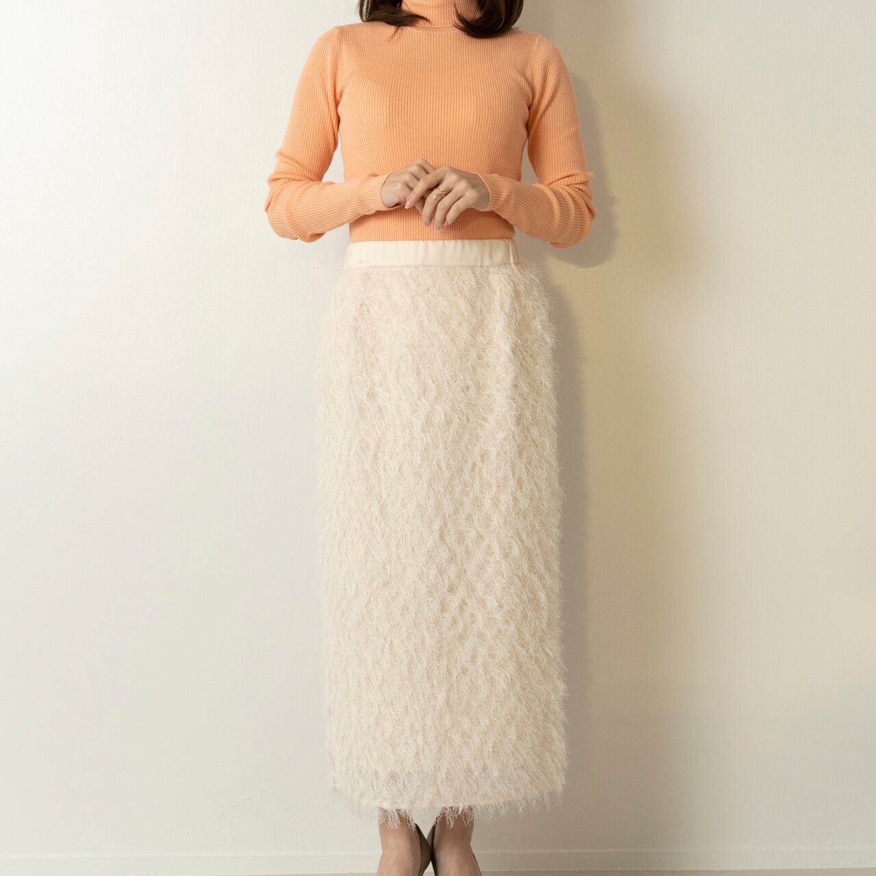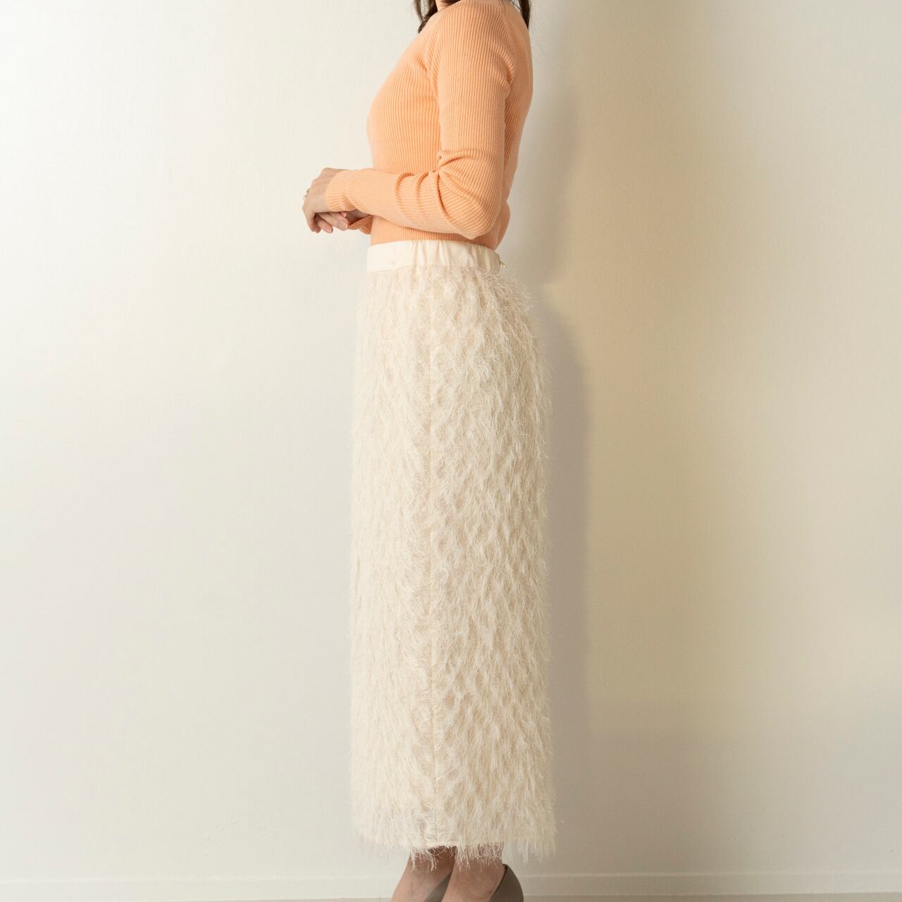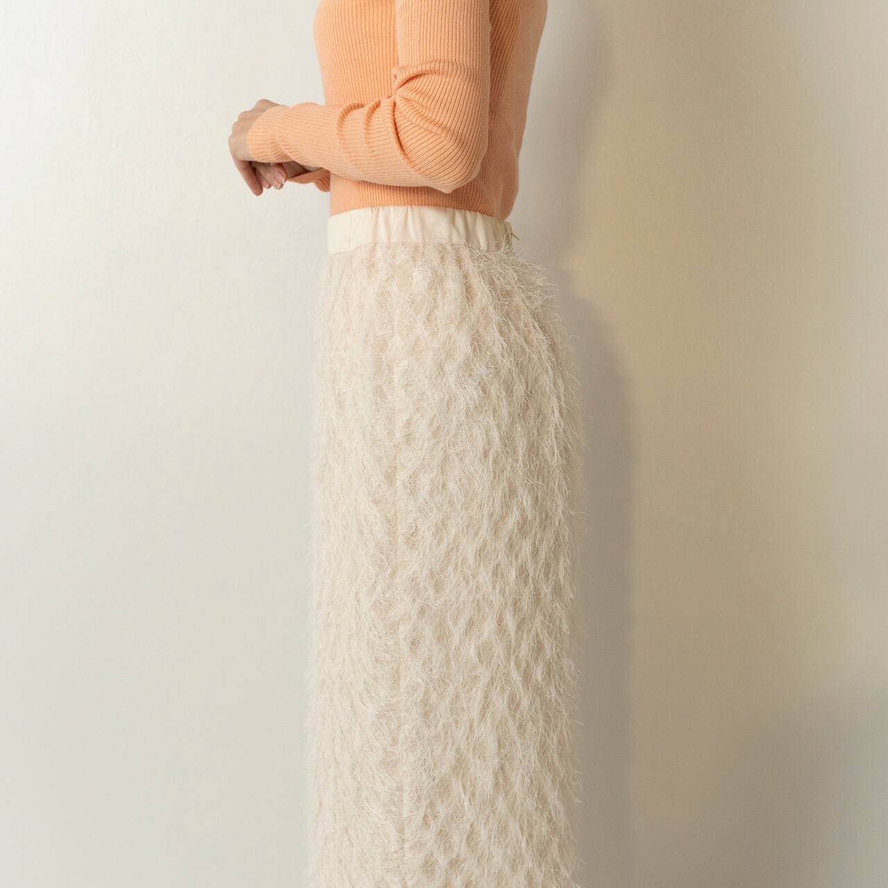 毛足の長い、フリンジのようなカットジャガード素材を使用したタイトスカート。