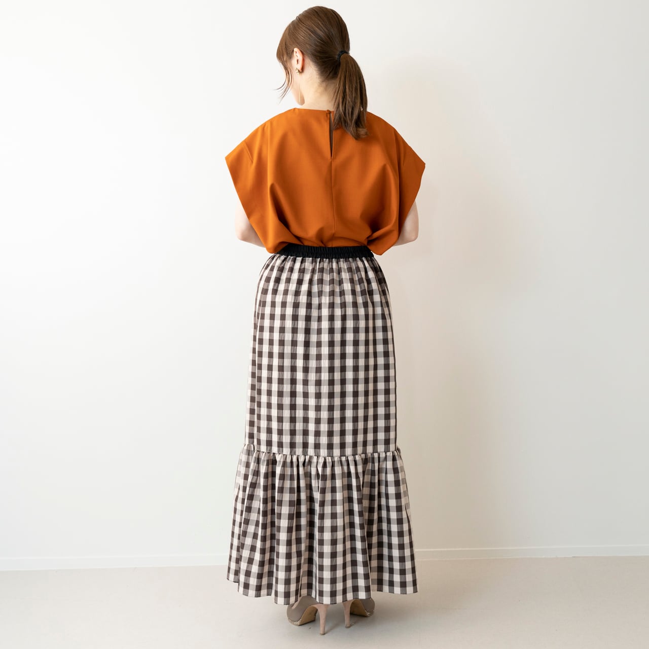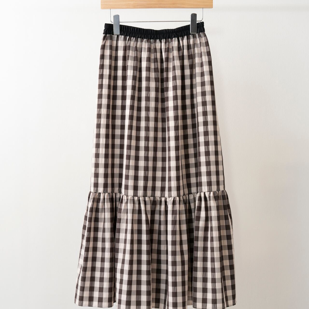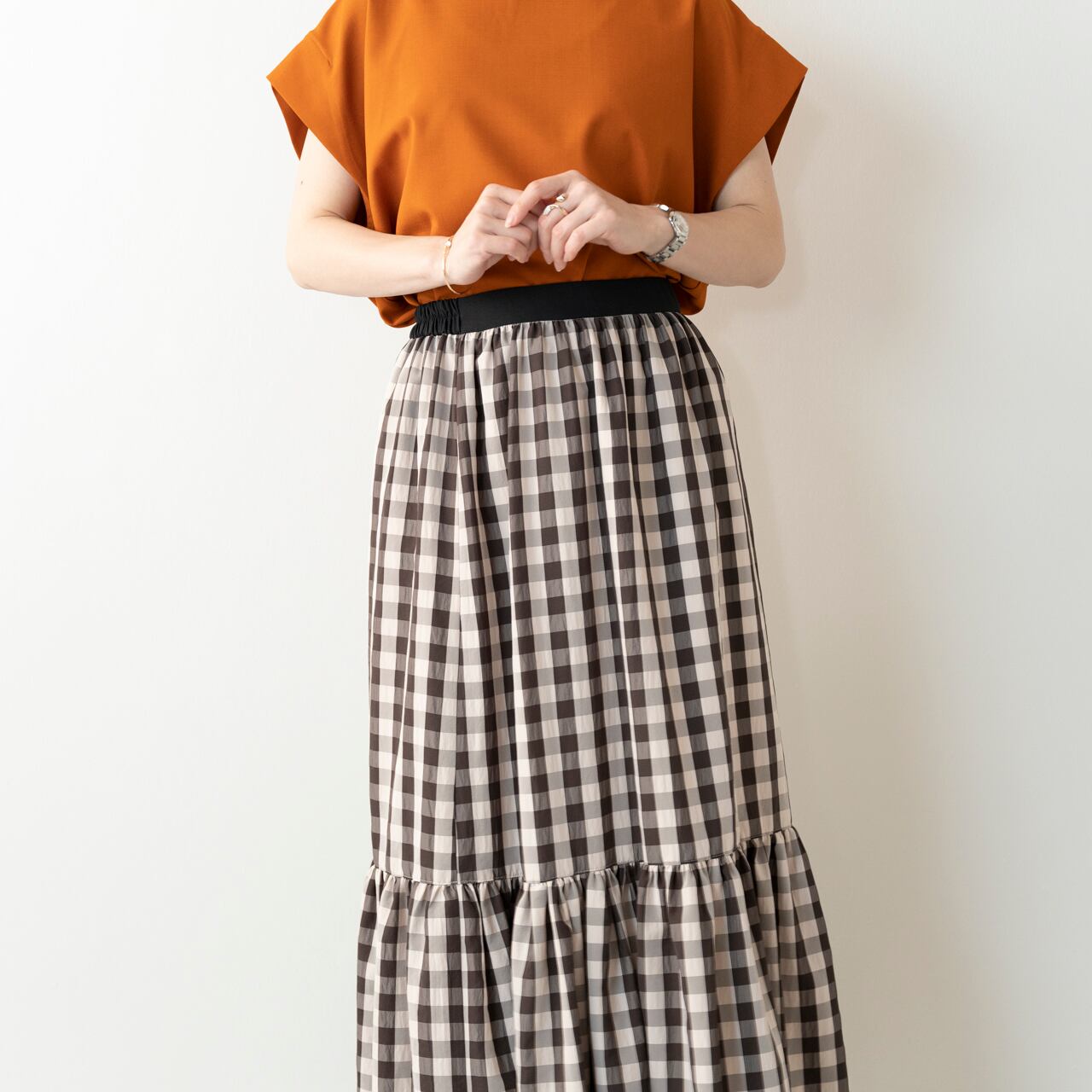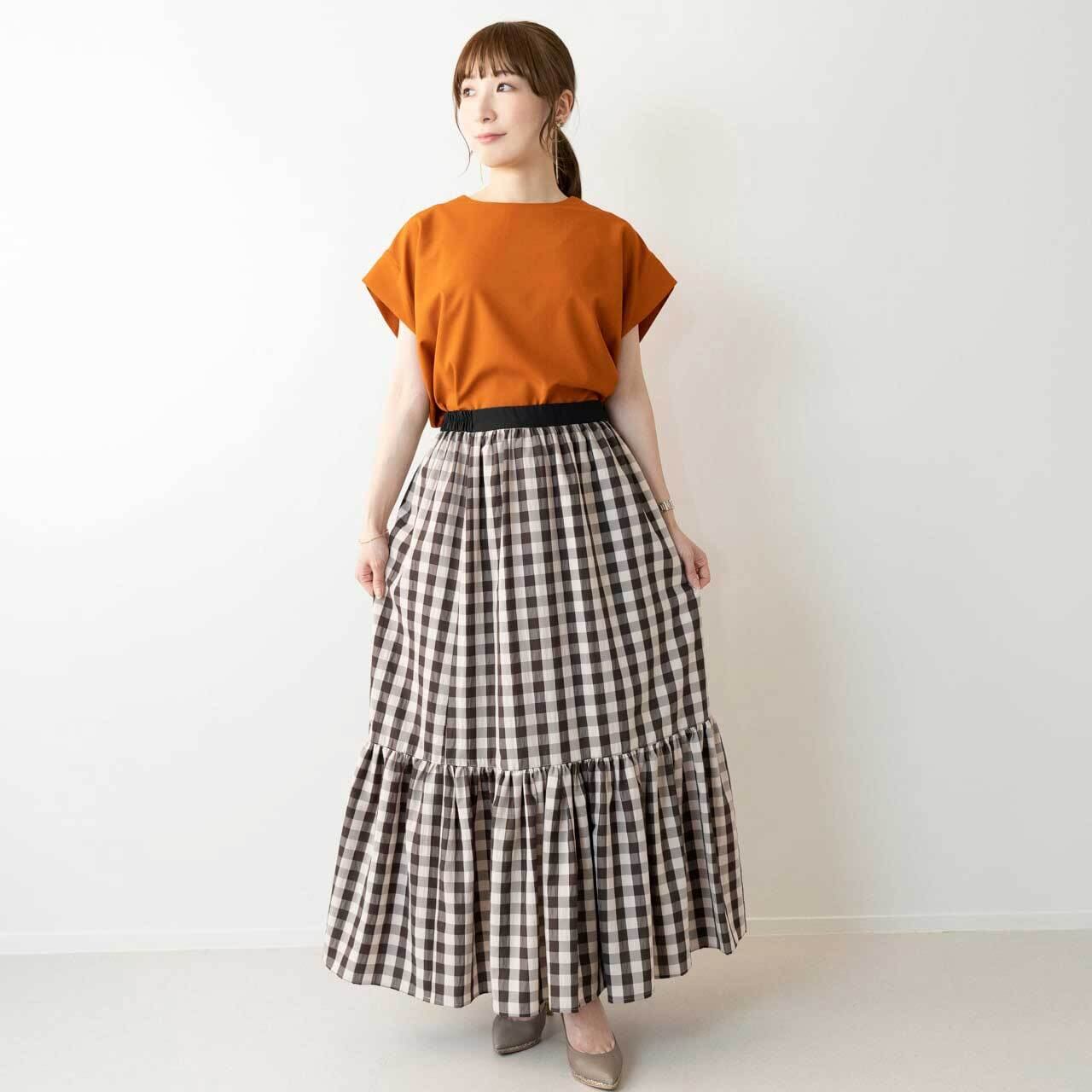 裾の切り替えにギャザーを寄せてボリュームをもたせたティアードスカート。