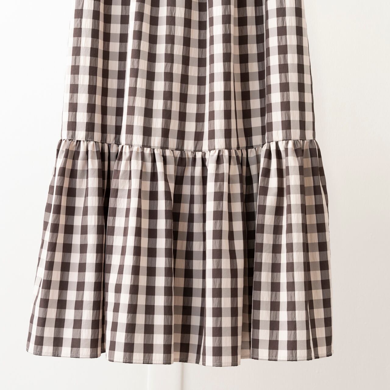 光沢感があり、タフタのように見えるギンガムチェックの素材を使用。